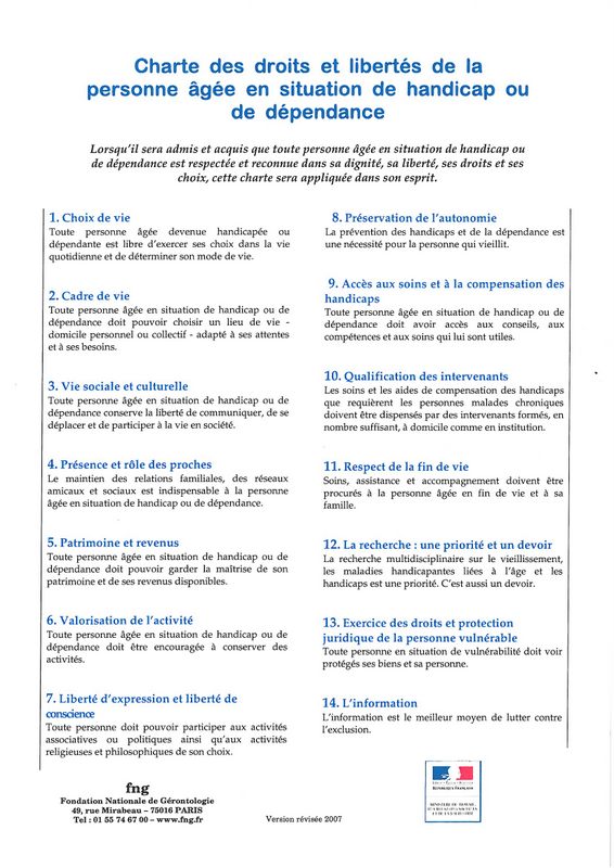 CHARTE DES DROITS ET LIBERTES DE LA PERSONNE AGEE EN SITUATION DE HANDICAP OU DE DEPENDANCE